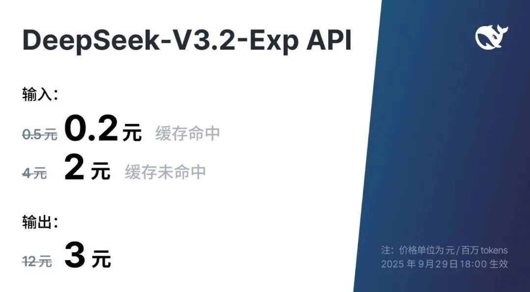 具体来看,输入价格上,缓存命中时,DeepSeek-V3.2-Exp从0.5元/百万tokens降至0.2元/百万tokens,缓存未命中的价格则从4元/百万tokens降为2元/百万tokens;输出价格上,从12元/百万tokens直接降到了3元/百万tokens。