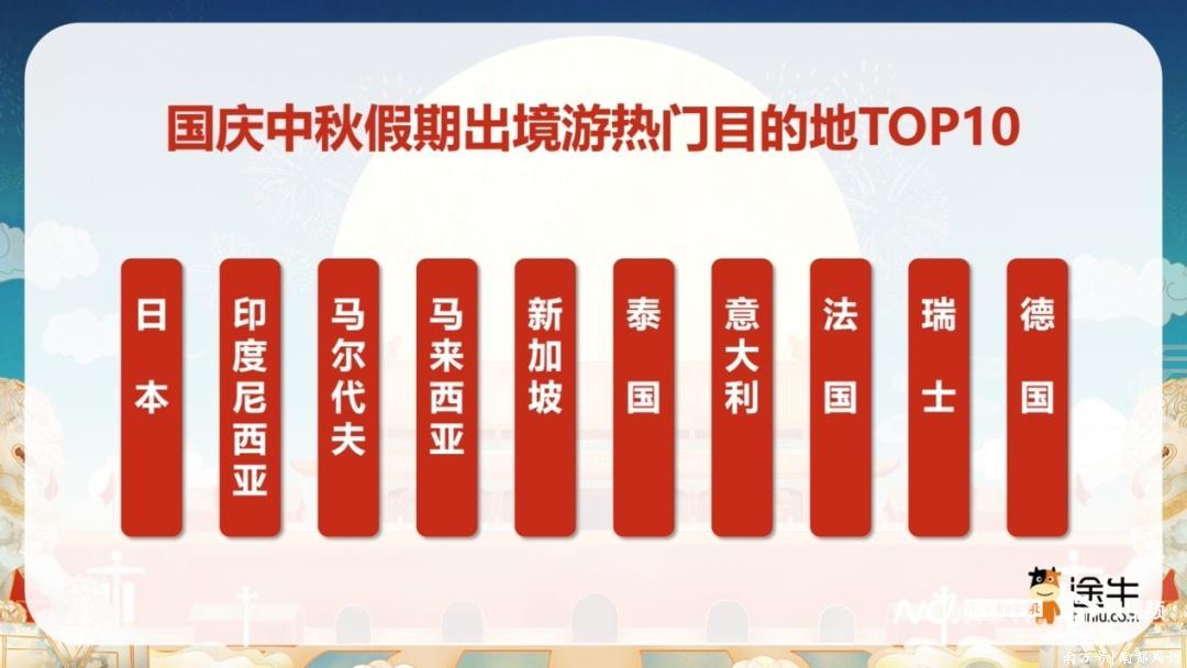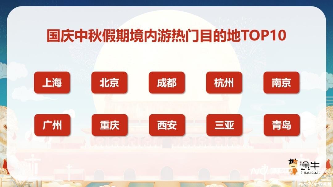 上海、北京、成都、杭州、南京、广州、重庆、西安、三亚、青岛成为今年国庆境内游的十大热门目的地。此外,黄山、日照、阿坝州、苏州、上饶、郑州、开封、天津、湖州、宜昌等地本周预订热度显著上升,环比增幅均超过100%。